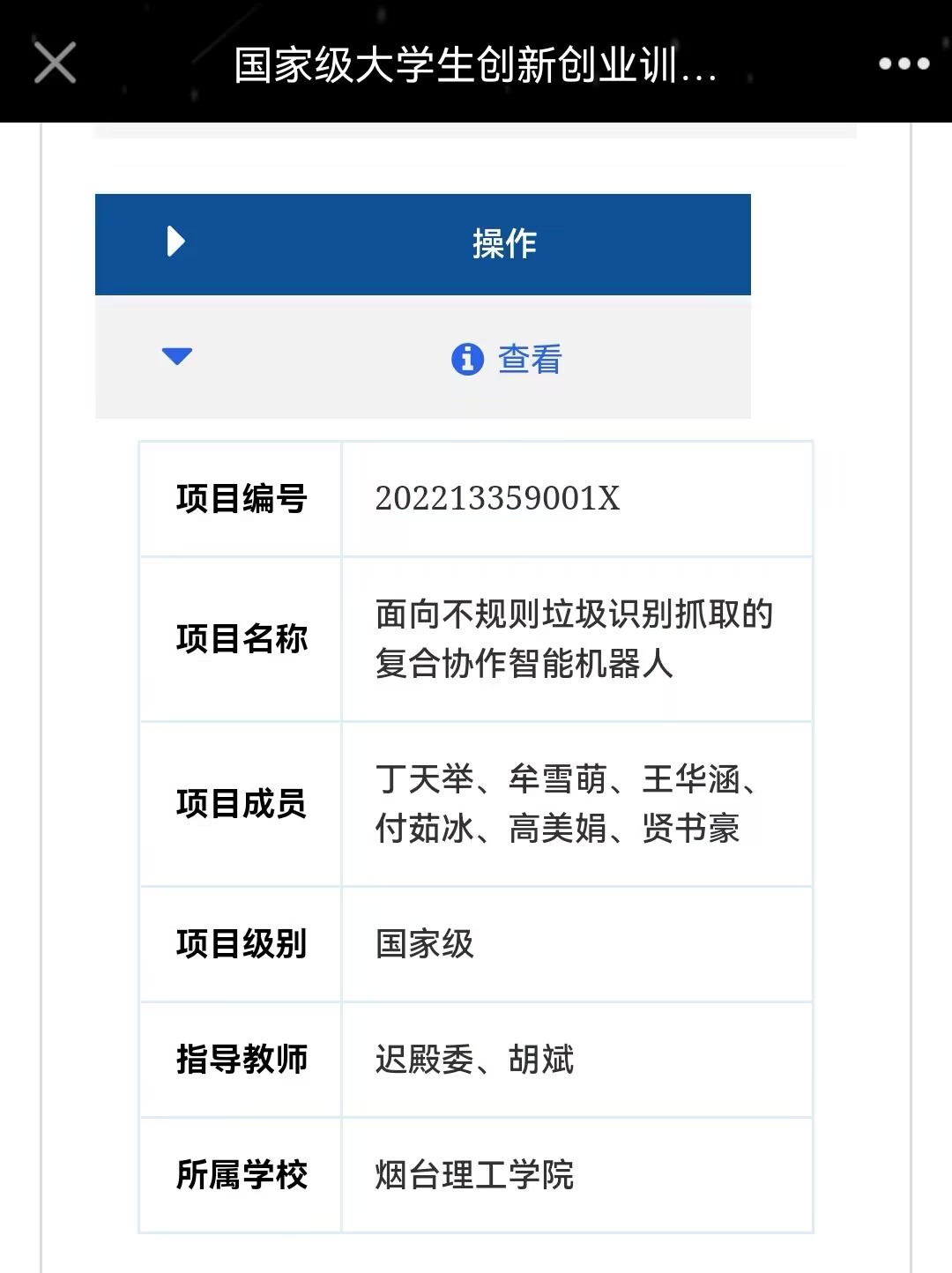 近日,根据《教育部高等教育司关于公布2022年国家级大学生创新创业训练计划项目和重点支持领域项目名单的通知》(教高司函〔2022〕10号),我院由胡斌、迟殿委老师指导的《面向不规则垃圾识别抓取的复合协作智能机器人》成为我校唯一一项成功入选山东省大学生创新创业训练计划项目。