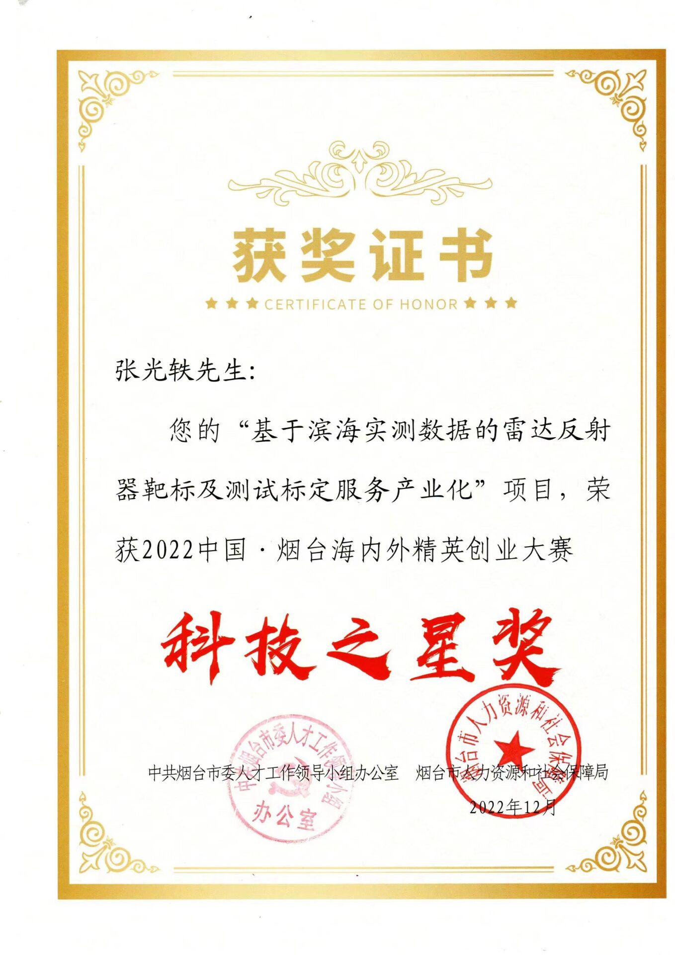 经过山东赛区预赛、山东赛区决赛、国内4大赛区决赛,张光轶老师申报的项目在279个项目中脱颖而出,并最终成为20个获奖项目之一,其本人也被评为“2022中国烟台海内外精英创业大赛科技之星”。