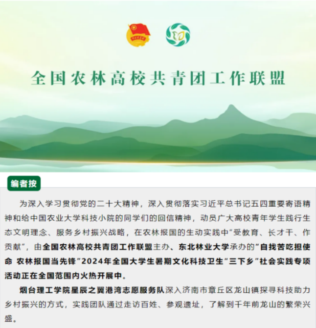 近日,在团中央青年发展部的指导下,团黑龙江省委学校部和全国农林高校共青团共同开展的“自找苦吃担使命 农林报国当先锋”2024年全国大学生暑期文化科技卫生“三下乡”社会实践专项活动中,我院港湾志愿服务队荣获优秀实践成果、优秀调研报告,指导老师陈鹏程荣获优秀指导老师称号。