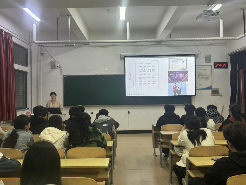 讲座伊始,逯文诺结合个人成长经历,强调文明礼仪在大学生人际交往与个人发展中的重要意义。讲座中她指出,中国乃文明礼仪之邦,尊师重教作为中华民族延续千年的精神血脉,深植于华夏文明的基因之中,是中华礼仪文化体系中最璀璨的明珠。并且作为新时代大学生,应继承优良传统,尊重师长,高度重视日常生活中的礼仪规范。随后,她从形象礼仪、行为仪态、社交礼仪等方面展开具体讲解,如指导同学们根据校园场景选择得体穿搭,现场示范标准站姿、坐姿等仪态,并针对宿舍生活、面试礼仪等实际问题分享实用技巧。