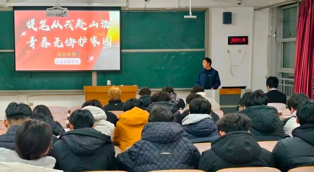 我院结合人工智能专业特色、创新宣传形式,在线上通过微信公众号进行主题推文,介绍军事领域智能装备研发、大数据分析、无人机操控等岗位对AI人才的需求;线下举办“智护家国”宣讲会,邀请退役复学的张弘贵同学分享在部队参与智能安防系统调试的经历,用“专业知识能为国防添砖加瓦”的真实体验打动在场学生。宣讲现场,张弘贵详细解读征兵条件、报名流程,重点梳理大学生士兵学费补偿、升学加分、提干优先等优惠政策,特别强调人工智能专业学子在信息化部队中的岗位适配优势,并为在场学生解答“专业技能在军营的应用场景”“退役后专业发展规划”等疑问,为同学们消除后顾之忧。现场同学表示:部队的智能化建设需要我们的专业能力,这是参军报国的好机会!