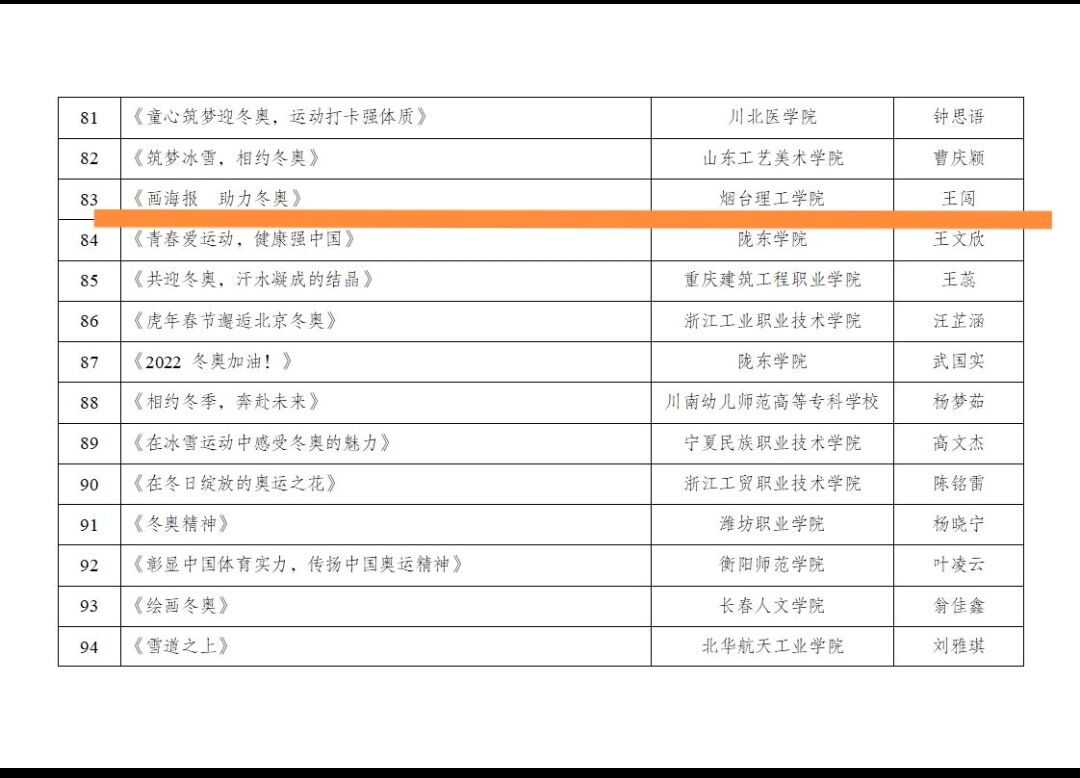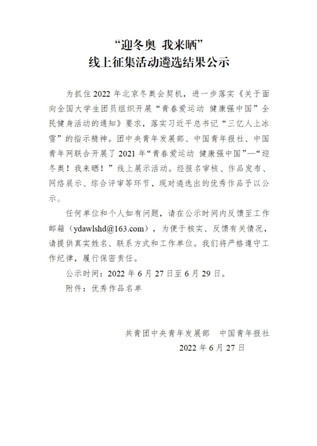 近日,由团中央青年发展部、中国青年报联合开展的2021年“青春爱运动 健康强中国”—“迎冬奥!我来晒!”线上展示活动优秀作品名单予以公示。全国共遴选出100项优秀作品,我院教师指导的3项作品获奖。
