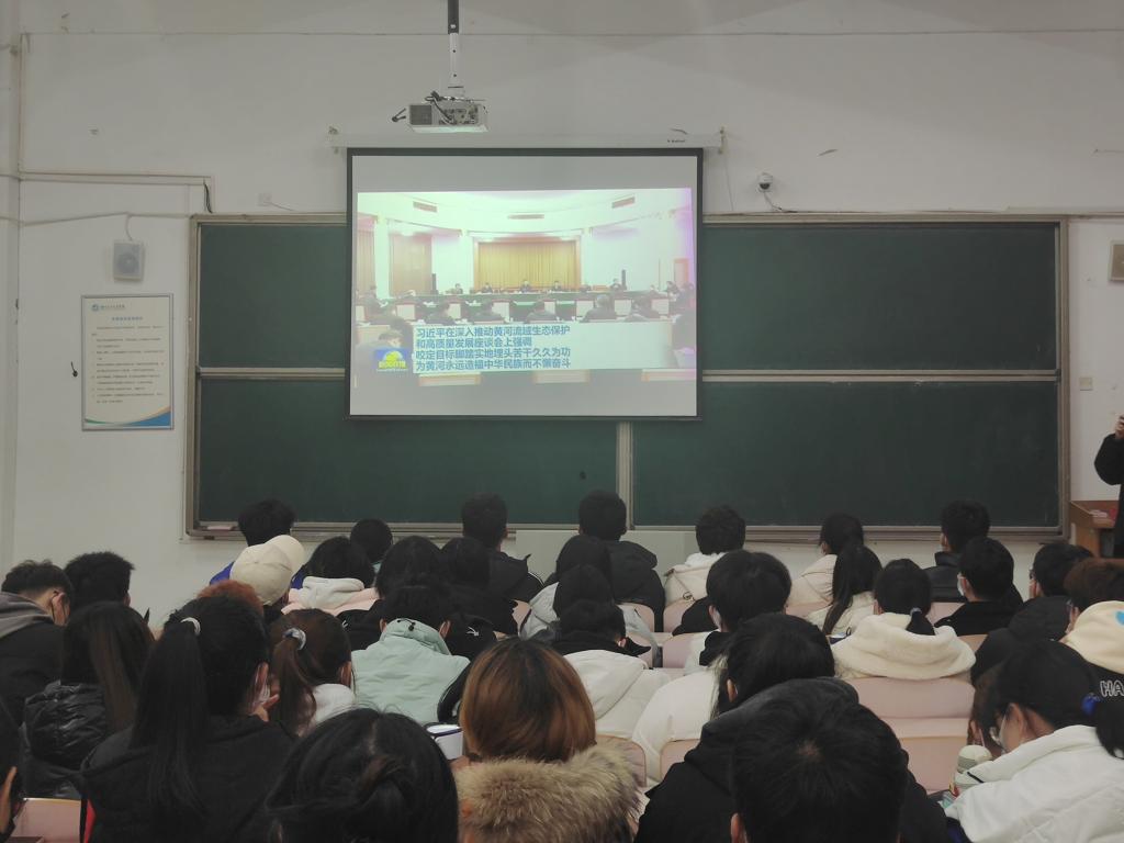 会议伊始,陈鹏程老师详细解读了习近平总书记在十九届六中全会上的重要讲话的深刻意义与精髓要义,紧接着,组织大家观看了习近平总书记《在黄河流域生态保护和高质量发展座谈会》上的讲话视频,进而使同学们进一步了解生态文明建设的重大意义。