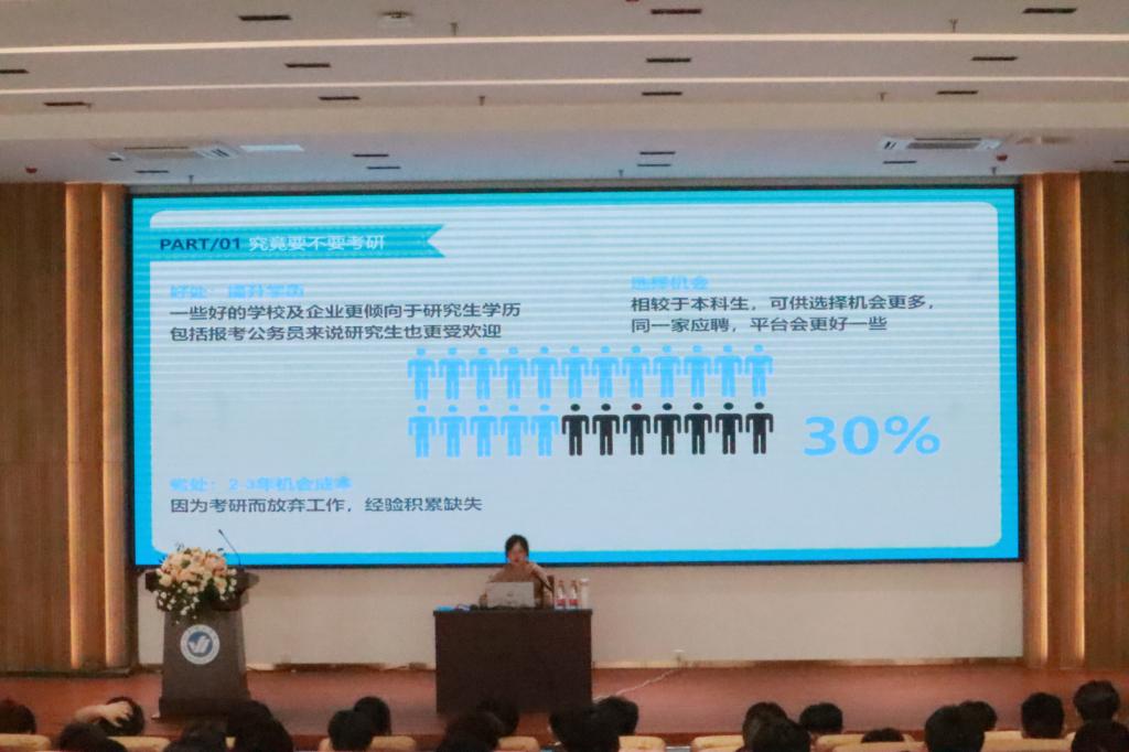 葛婷婷老师以“高效考研”为主题,分别从考研目的、考研目标、考研计划等方面给同学们做了深刻讲解。王飞老师以“快乐考研”为主题,列举成功考研的案例,让学生明确了考研目标,坚定考研决心。随后两位老师回答了同学们提出的疑惑,结合实际情况给学生们提供更多考研建议。最后同学们纷纷表示,在听过老师们的详细讲解后,自己对考研学习的热情提高很多,也对考研过程有了一个更具体、更清晰的认识。