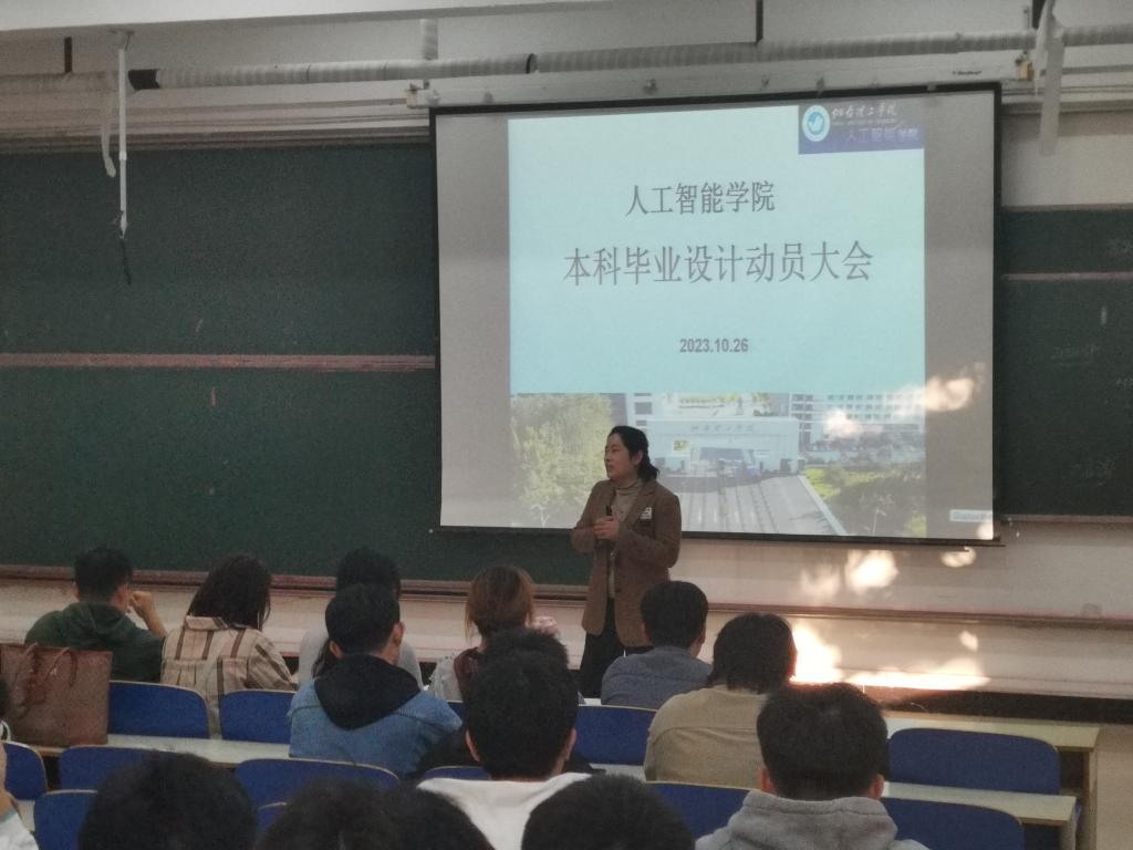 本科毕业设计是实现本科人才培养目标的重要实践性教学环节,是对学生大学四年所学专业知识的检验。为了做好2024届毕业设计工作,我院于2023年10月26日下午16:00在一教101召开了2024届毕业设计(论文)动员大会。学院院长助理徐红梅、人工智能专业教研室主任迟殿委、数据科学与大数据技术教研室主任孔德昱、机器人工程教研室主任张文龙、自动化专业教研室主任韩爱丽、毕业设计指导教师以及全体2024届毕业生参加了本次动员大会,会议由院长助理徐红梅主持。