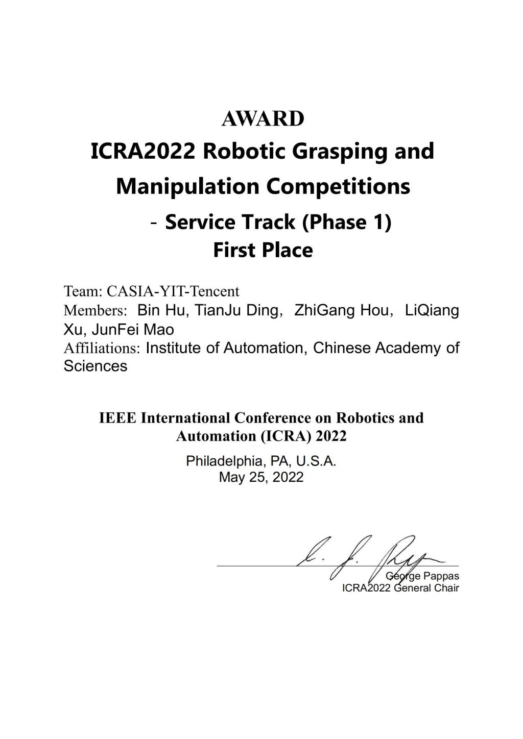 近日,国际机器人技术与自动化会议ICRA在美国宾夕法尼亚洲会议中心落下帷幕。我院机器人应用研究院院长胡斌博士带领团队参赛,并荣获机器人抓取与操作竞赛(Robotic Grasping and Manipulation Competition)竞赛服务组第一赛段冠军。