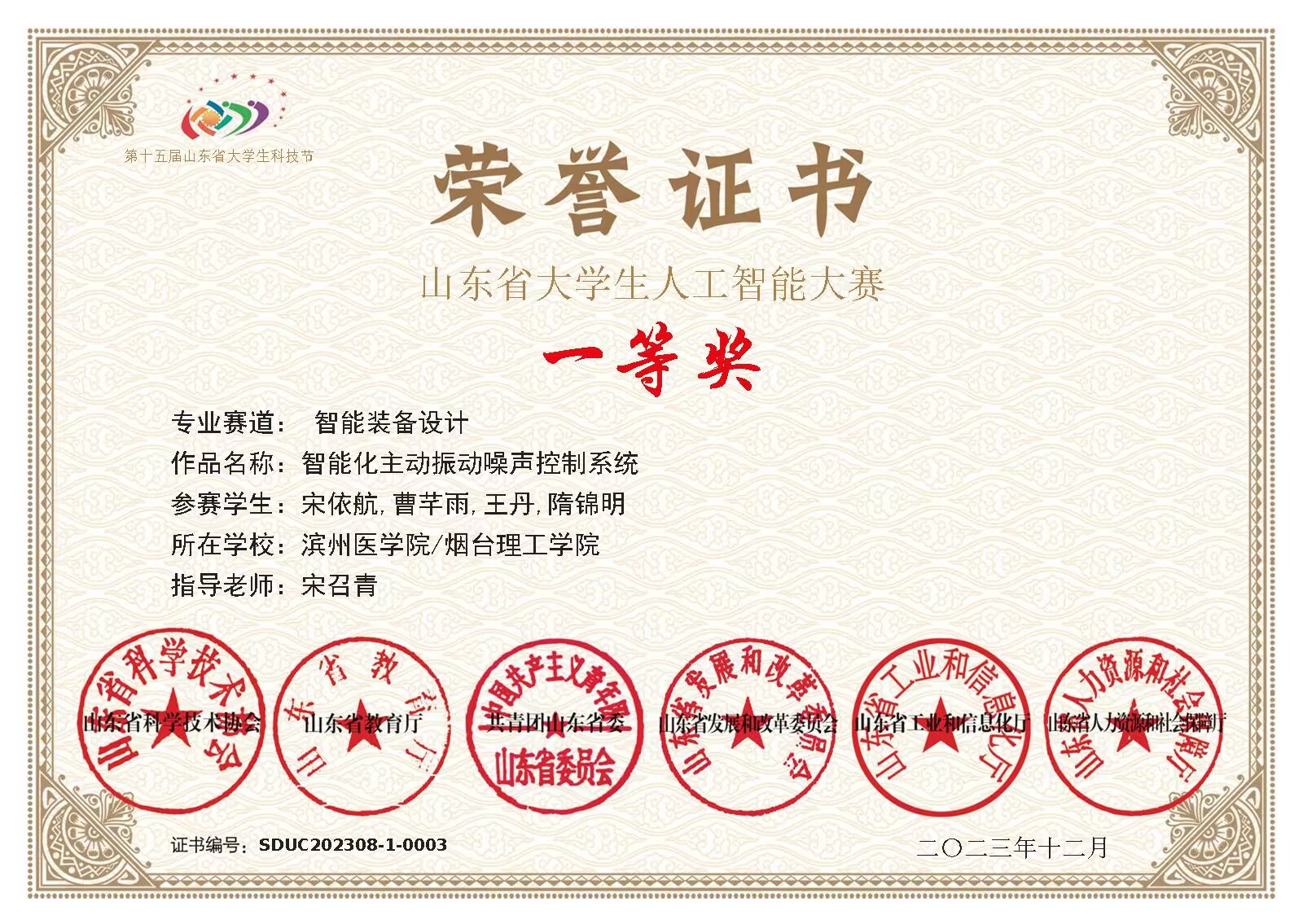 近日,第十五届山东省大学生科技节第六届山东省大学生人工智能大赛——智能装备设计赛在山东省乐陵市落下帷幕。由宋召青老教授指导、我院学子曹芊雨、王丹等同学的作品“智能化主动振动噪声控制系统”在比赛中斩获佳绩,斩获一等奖。