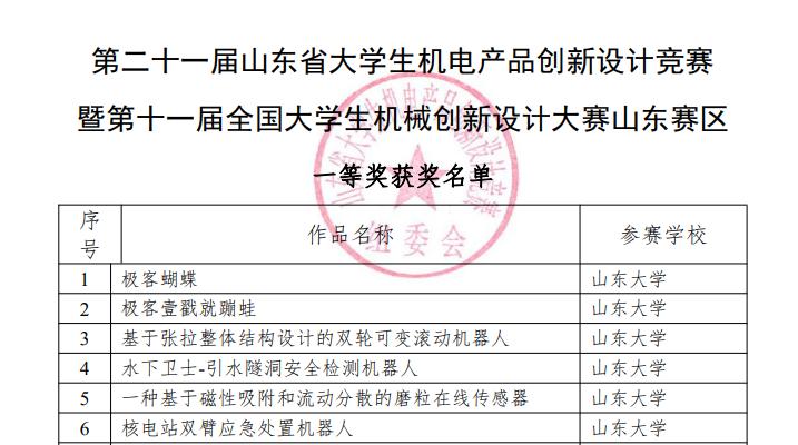 近日,第二十一届山东省大学生机电产品创新设计竞赛暨第十一届全国大学生机械创新设计大赛山东赛区决赛在齐鲁工业大学圆满落幕。由徐红梅和胡斌老师指导的参赛队伍普罗米修斯队(程涛、李凤英、秦明华、薛入瑞)荣获山东赛区一等奖。此外,徐红梅老师获得“优秀指导教师”称号,学院荣获“优秀组织单位”称号。