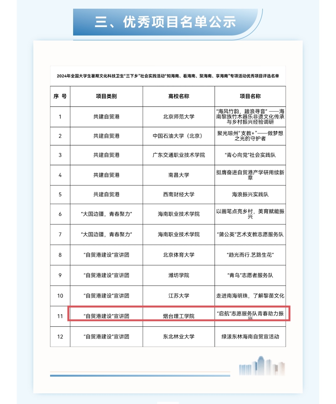 为激励青年大学生在基层一线的生动实践中受教育、长才干、作贡献,充分发挥青年大学生团员的生力军、先锋队作用,共青团海南省委、海南大学于2024年暑期开展的2024年全国大学生暑期文化科技卫生“三下乡”社会实践“知海南、看海南、聚海南、享海南”专项活动,得到全国各地高校师生的广泛关注。我院两支队伍参与专项,最终“启航”志愿服务队荣获专项活动优秀项目荣誉。