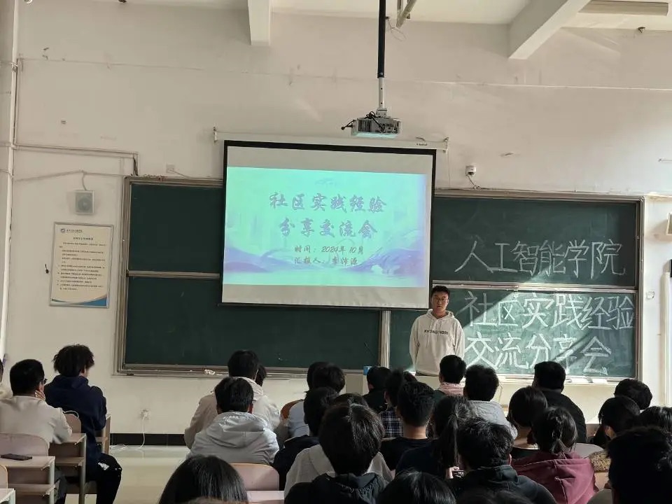 在分享会上,参与过社区实践的同学代表们生动地讲述了他们在实践中的经历与收获。陈浩楠同学分享了自己进行社区实践的案例分析与经验。徐艺鸣同学分享了运用专业知识为社区居民解决实际问题的过程,如帮助老年人了解和使用智能设备,展现了人工智能在改善生活中的强大作用。还有李沛源同学讲述了在社区实践中可能存在的问题,以及给出了相关的解答,并强调了团队合作的重要性。
