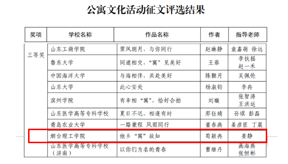 近日,由山东省教育厅主板、山东省学校后勤协会高校公寓分会承办的《关于2022 年高校“公寓的故事”主题系列活动》评选结果公布。此次活动全省共125所高校参与,共推荐1128件作品,参与学校数量和推荐作品数量均创历史新高,我校《人与人和谐——“宿舍矛盾那些事”》获公寓育人精品课二等奖,征文作品《他乡“寓”故知》获公寓文化活动征文三等奖,在同类院校中成绩斐然。