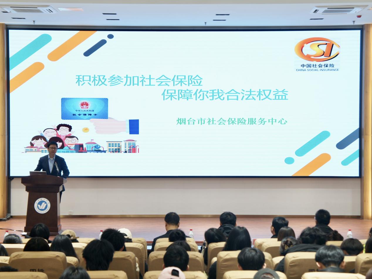 讲座分为“留烟就业创业政策宣讲”、“积极参与社会保险”和“莱山区人才政策解读”三大板块。讲座伊始,刘东辉科长就高校毕业生就业创业政策进行解读,从人才生活及购房补贴、高校毕业生就业政策、高校毕业生创业政策和高校毕业生就业手续四个方面进行全面讲解。刘科长结合相关政策为学生提供合理的就业建议,引导学生树立良好的就业创业观,并详细介绍烟台市为留烟人才提供的优惠政策及多项措施。随后,社保中心科室负责人刘晓阳就了解社会保险、为什么要参加社会保险、如何参加社会保险三个方面为同学们强调了参与社会保险的重要性,鼓励学生积极参与社会保险。讲座最后,莱山区公共就业和人才服务中心朱文顺通过视频全方位展示了烟台市莱山区的区位优势,详细介绍了莱山区的人才体系、营商环境和人才政策,使学生更加全面地了解烟台的就业普惠政策,为“留烟”就业打下良好基础。
