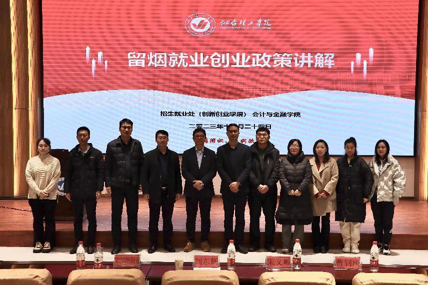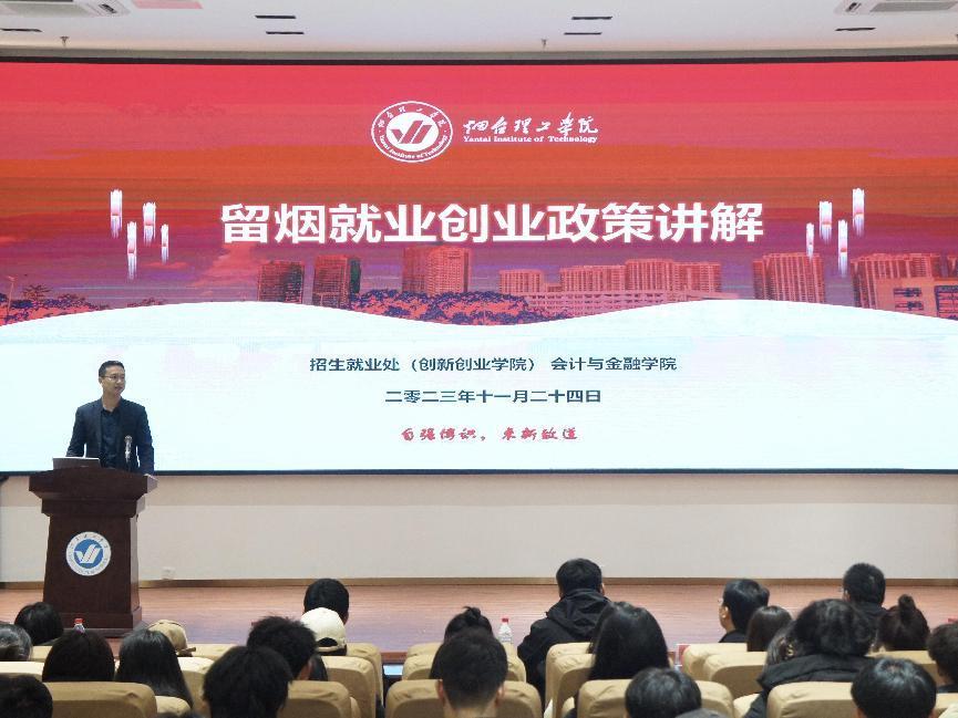 为进一步做好就业创业服务工作,引导学生树立良好的就业创业观,11月24日下午,由招生就业处(创新创业学院)主办,会计与金融学院承办的留烟就业创业政策专题宣讲会于综合楼六楼学术报告厅举办。此次活动邀请烟台市人力资源和社会保障局毕业生服务科科长刘东辉、烟台市社会保险服务中心科室负责人刘晓阳、莱山区公共就业和人才服务中心朱文顺担任主讲人,会计与金融学院党总支书记曹钊庆,各二级学院负责就业创业工作辅导员、就业创业联合会学生干部代表、2024届毕业生代表及招生就业处相关人员参加了本次宣讲会。